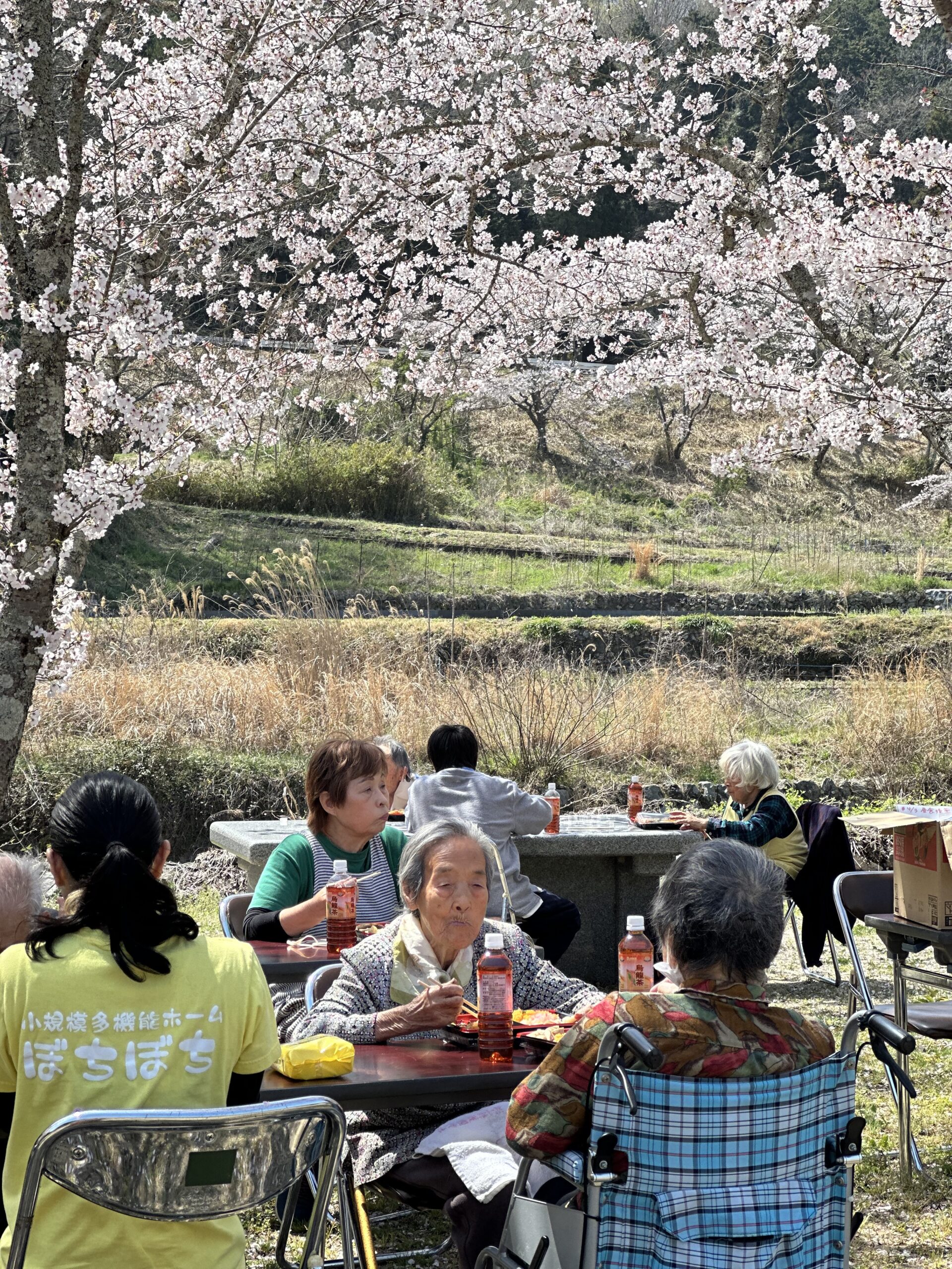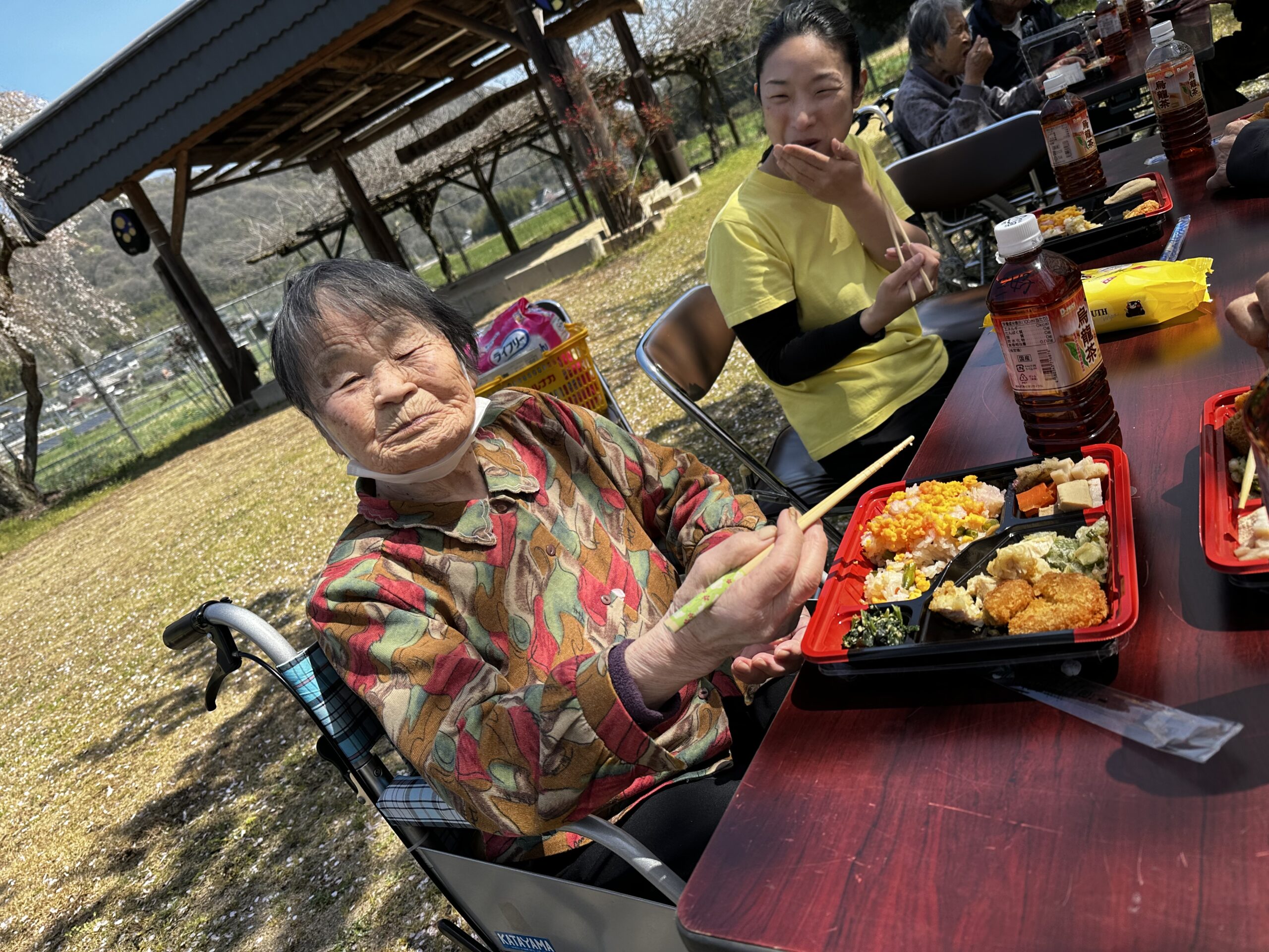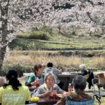 桜舞い散る中、みんなでワイワイとお弁当を食べる。