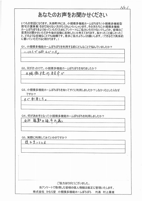 徘徊で悩んでいました。矢掛病院の紹介で、場所も会社通勤の途中にあるため利便性もよく、すぐに利用させていただきました。とても役に立っています。いつもありがとうございます。